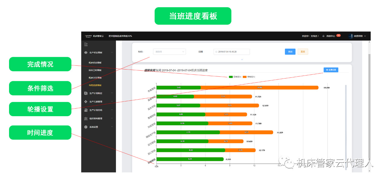 管理層使用的生產進度看板,目視化管理掌握設備運行情況,總體把握生產進度。